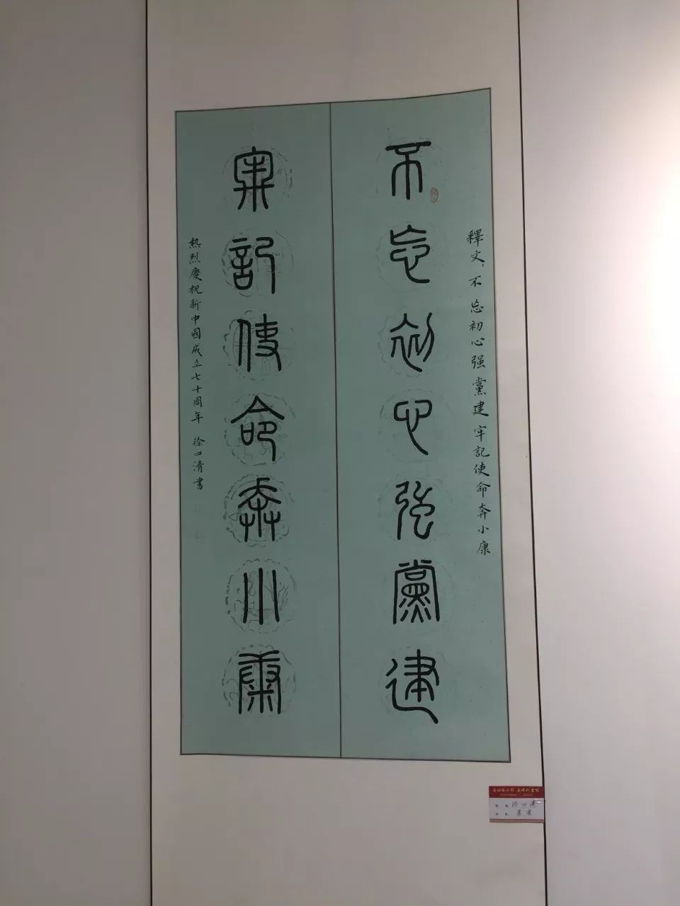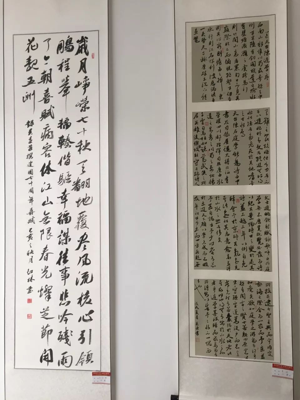 参加本次展出的80件书法作品主题鲜明、内涵丰富,参展作者均通过自己手中的笔,向新中国70华诞献礼;作品形式多样,楷行草隶篆,中堂斗方扇,或气势宏伟,或工整精美。