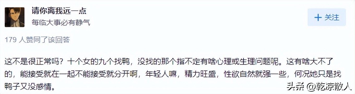 “这不是很正常吗?是个女的九个找鸭,没找的那个指不定有啥心理或者生理问题呢。这有啥大不了的,能接受就在一起不能接受就分开啊!”