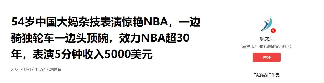 信息来源:《54岁中国大妈杂技表演惊艳NBA,一边骑独轮车一边头顶碗,效力NBA超30年,表演5分钟收入5000美元》,观威海,2025年2月17日。