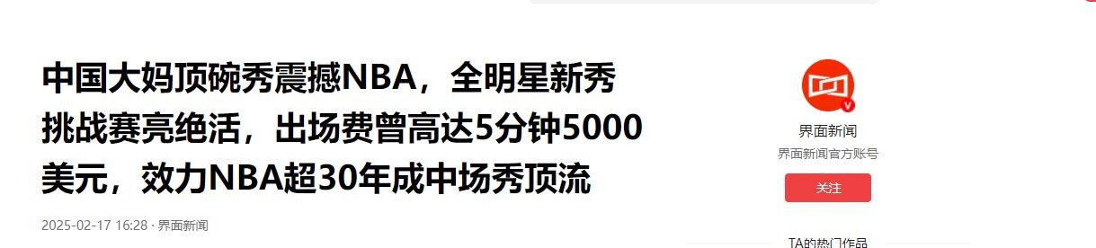 信息来源:《中国大妈顶碗秀震撼NBA,全明星新秀挑战赛亮绝活,出场费曾高达5分钟5000美元,效力NBA超30年成中场秀顶流》,2025年2月17日。