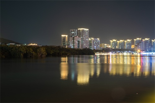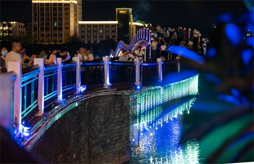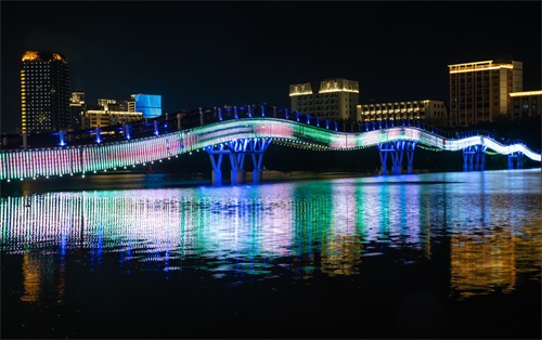 因情人桥靠近第一市场,许多游客会去第一市场周边享用晚餐,刚好灯光亮起之时,晚餐享用完毕,顺便到这里来散散步,消消食,欣赏一下三亚河两岸的夜晚风光。它将四周建筑倒映,是那么的安静而祥和。