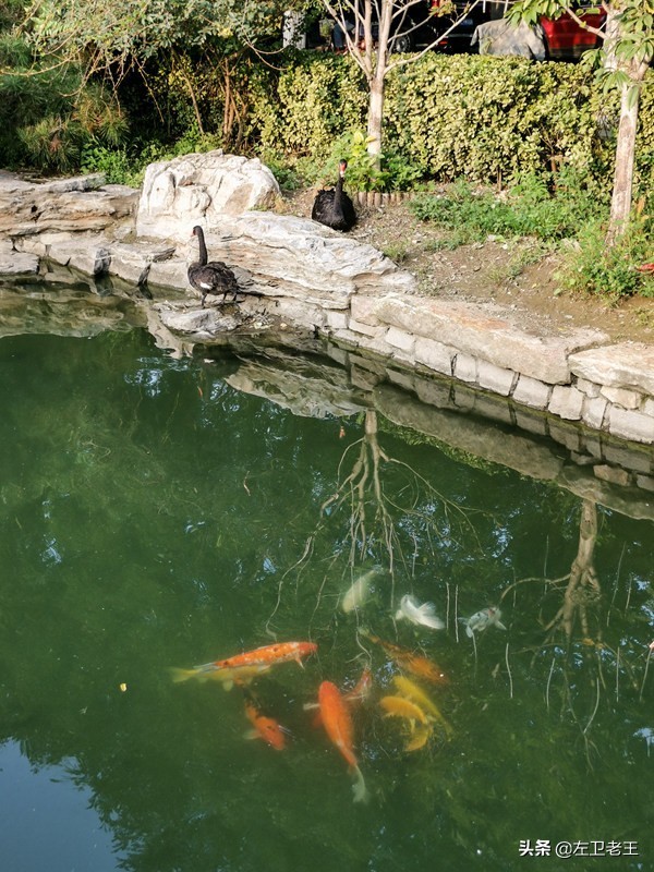 ▲ 河道内红色、黄色和白色的锦鲤以及岸边的黑天鹅