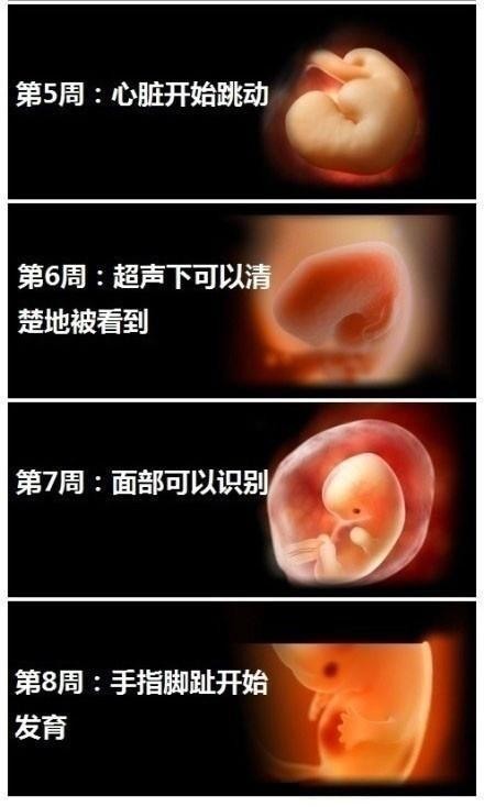 等到了第五周的时候,胎儿的心脏就会开始跳动,在第6周的时候,胎儿的心脏在B超下可以清楚的看到,第7周的时候,胎儿的面部形状也就可以看到了,到了第8周的时候,胎儿的手指脚趾开始发育,差不多也可以看到一些变化。这些过程都是一天一天来的,胎儿的发育是非常神奇的一个过程。