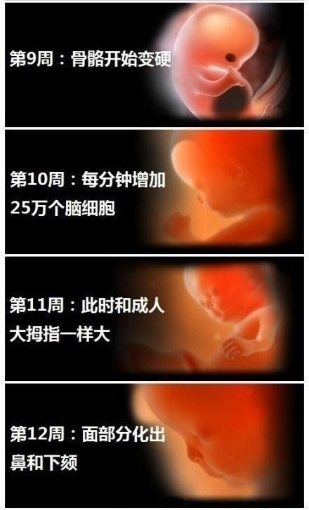 到了第9周的时候,胎儿的骨骼就开始发育,逐渐变硬,第十周的时候,胎儿的细胞分裂开始增多,尤其是脑细胞开始增多,大脑开始发育。到了第十周的时候,胎儿的大拇指几乎可以很清楚的看到了,第12周的时候,胎儿的面部开始分化出鼻子和下颏,逐渐的有了一定的形状。
