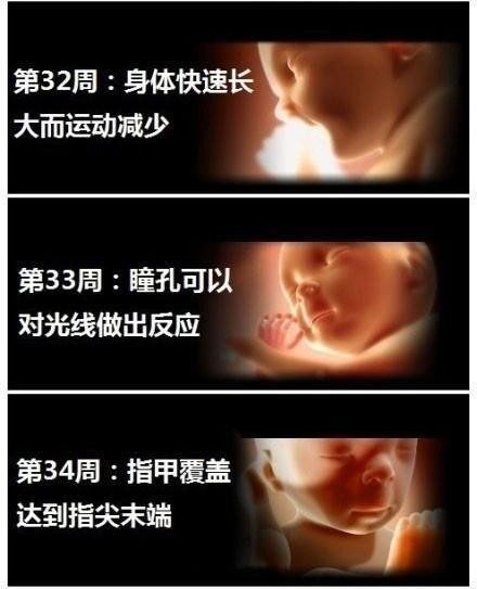 到了32周的时候,胎儿的身体发育比较快,胎儿的活动相对来说比较少了,在33周的时候,胎儿的瞳孔可以对光线有了反应。胎儿的指甲也开始形成了。