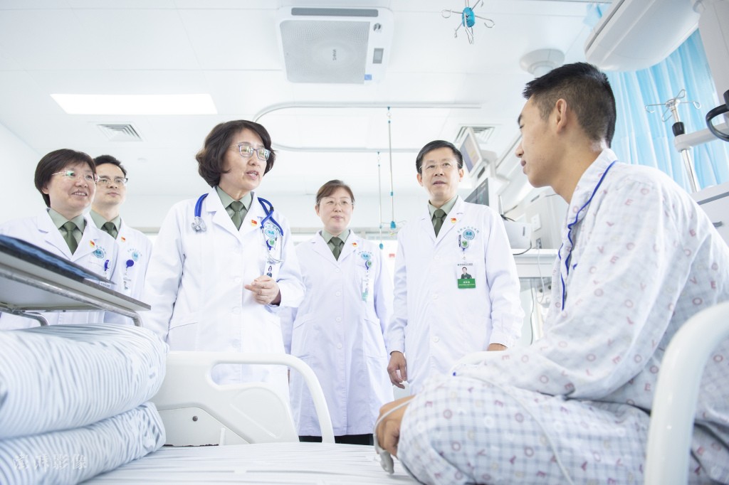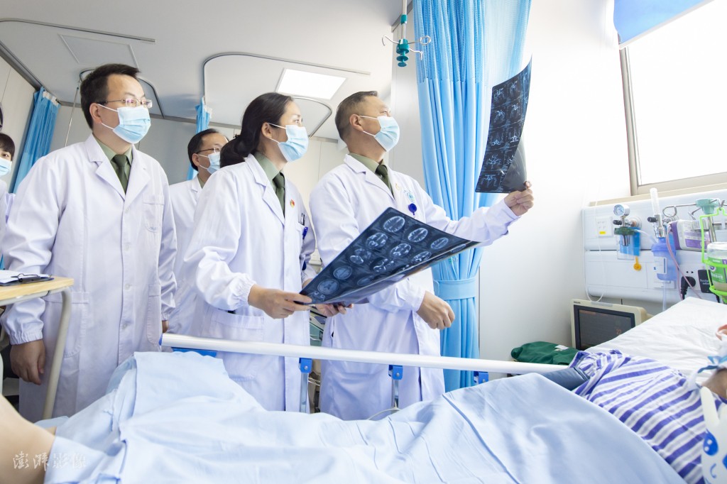 8月15日,江苏南京。在东部战区总医院住院部,医务人员在查看患者健康情况。图片来源:余海洋/澎湃影像