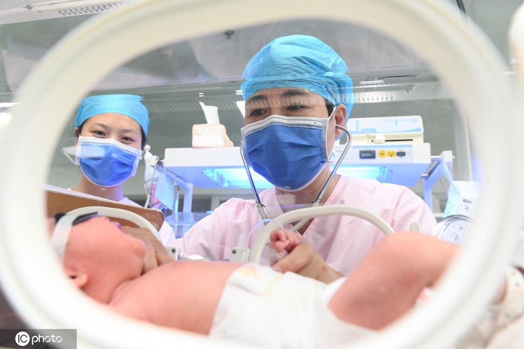 8月18日,在河北省石家庄新乐市医院新生儿病房,医务人员正在给新生儿而检查身体。图片来源:IC photo