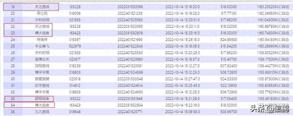 “天达赛鸽”的两羽赛鸽先后完成报到,空距517公里,成绩分别排在第十九名、二十二名。