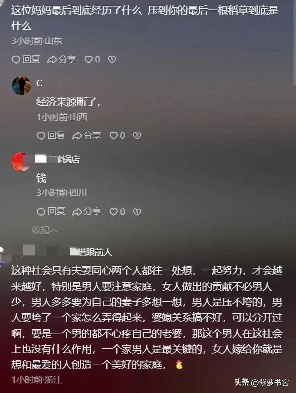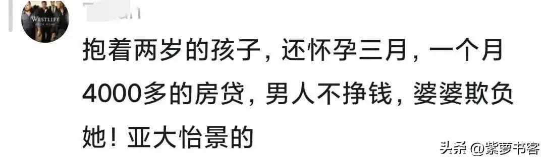 有网友说,她抱着两岁的孩子,自己本身还怀孕了三个月,生活确实过得很艰难,还有房贷要还,老公又没有工作,自己在家庭里地位又特别的尴尬……