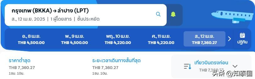 调查显示,飞往北部地区的机票中,曼谷-南邦府机票起价超4,000泰铢,最贵4月12日达7,360.27泰铢;曼谷-清迈府机票起价超2,000泰铢,最贵超3,000泰铢。