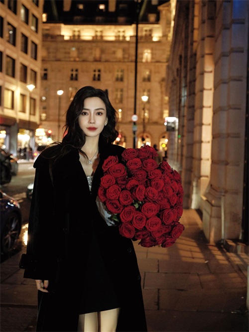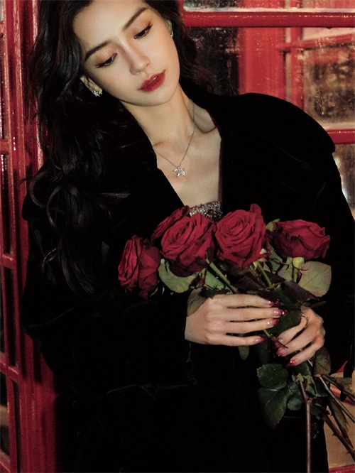 之后还有另外两组照片,这两组照片的着装都是相似的,首先得就是她手里抱着的一大束玫瑰,十分的抓眼。