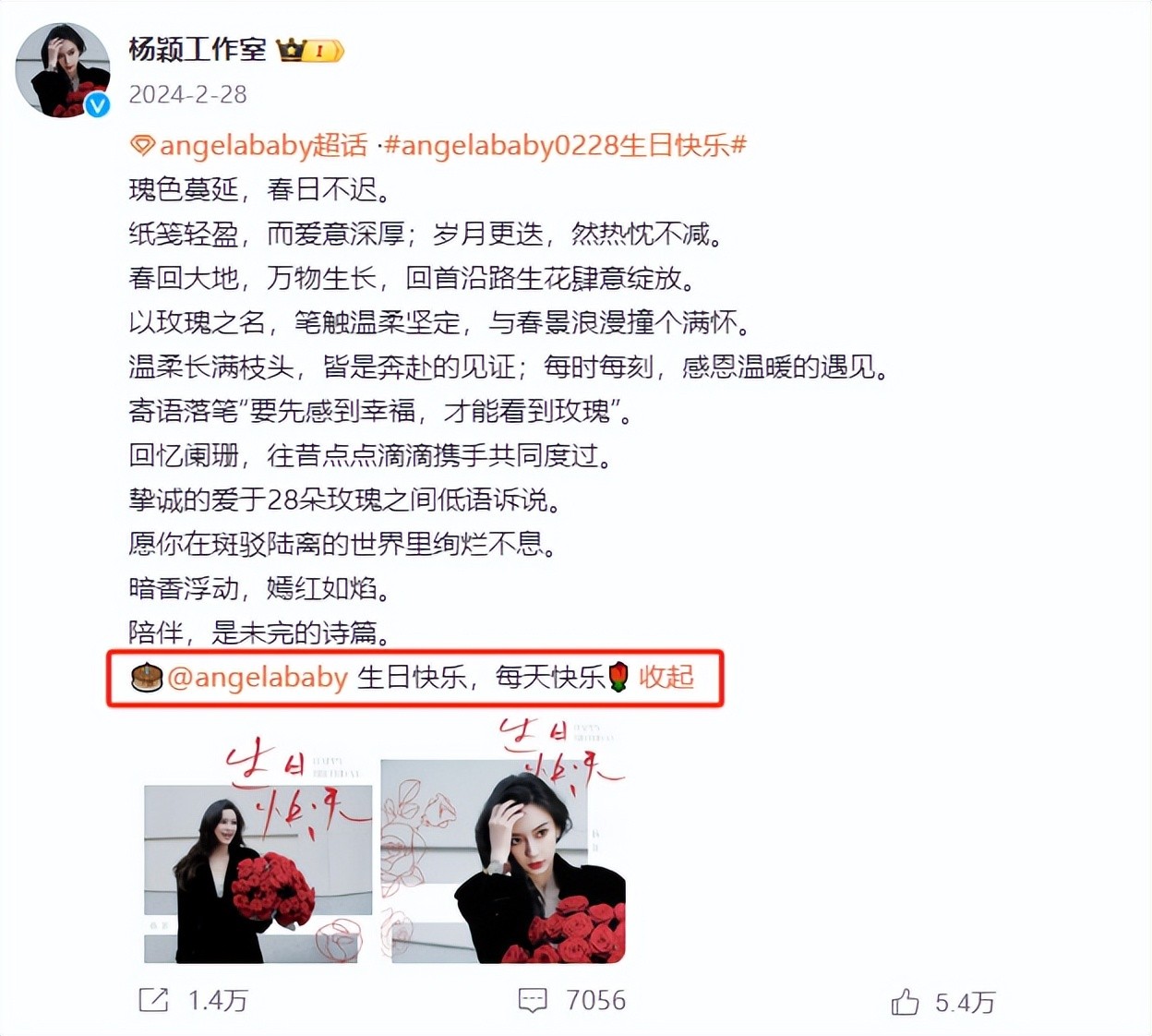 今天就是Angelababy的生日,就在今天她工作室发出了几组生日照。