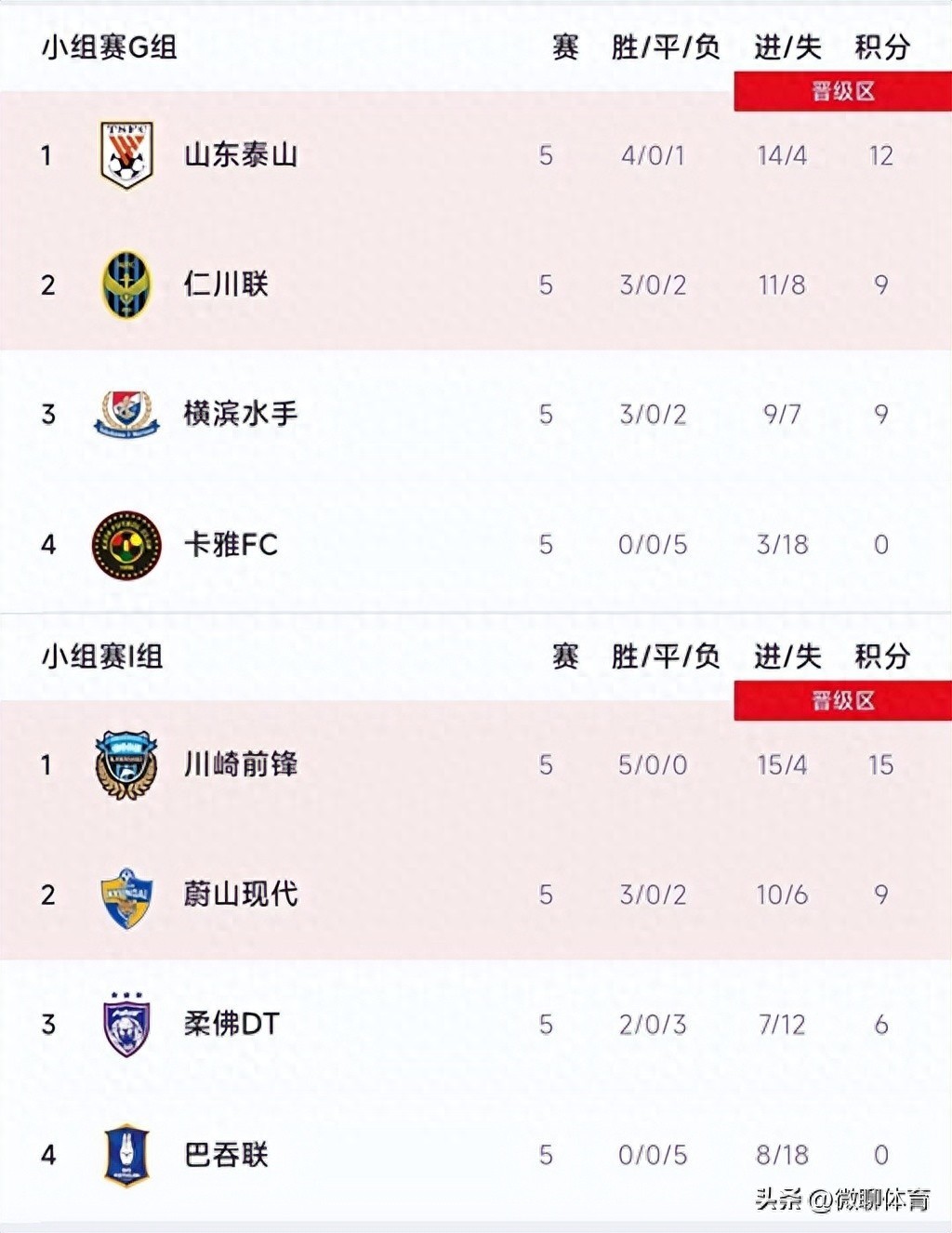 北京时间11月29日,我们一起看看东亚区亚冠小组赛的最新积分榜,G组和I组已经结束了小组赛第5轮的较量,主要的信息如下:山东泰山6-1大胜卡雅,仁川联2-1战胜横滨水手;川崎前锋5-0大胜柔佛新山,蔚山现代3-1巴吞联。