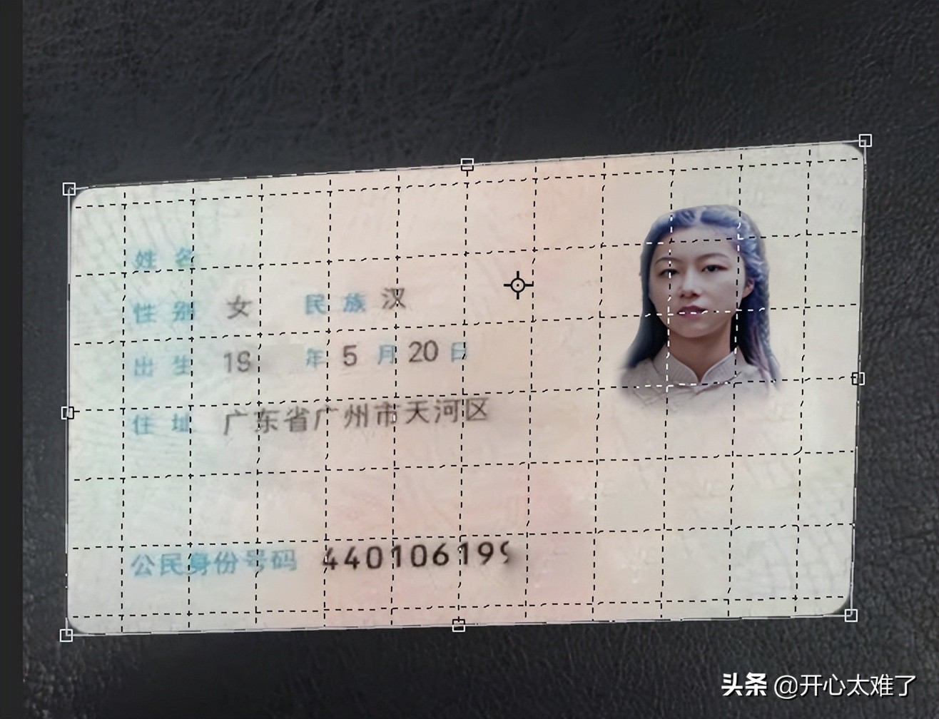 使用“透视裁剪工具”依次点击身份证的四个角,框选整个身份证。可以用鼠标拖动四周的锚点调整网格的位置,使网格完全贴合身份证。