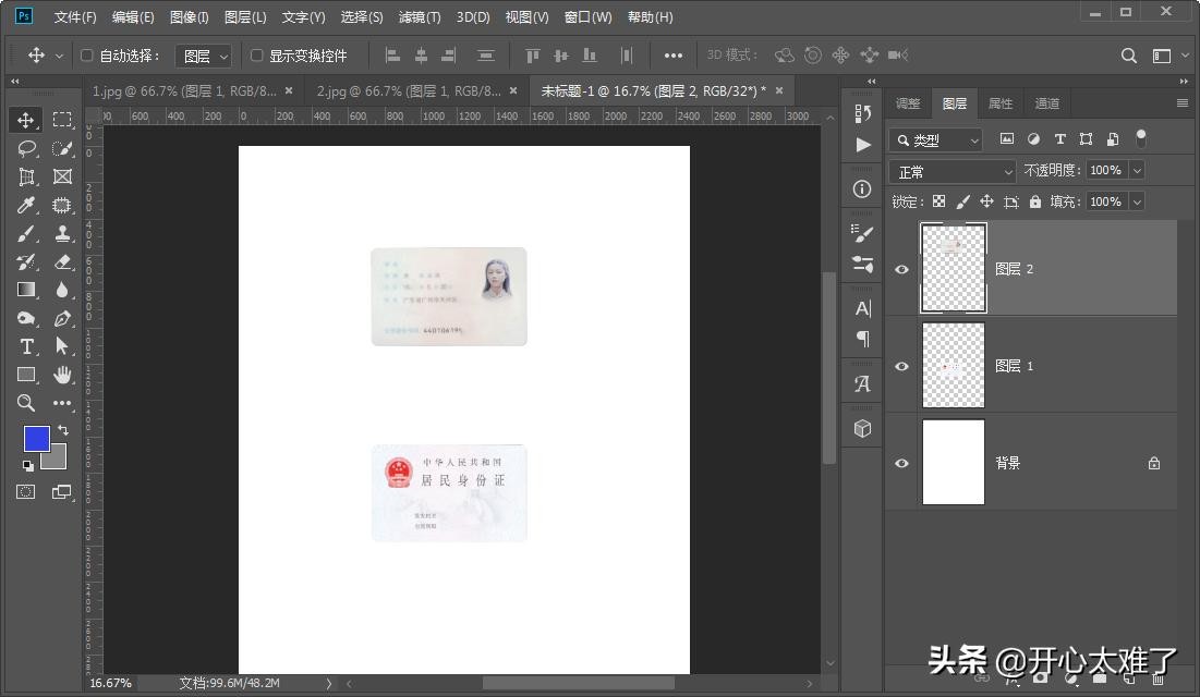 把处理好的身份证正反两张照片分别拖入新建的文档中,移动到合适的位置。打印出来,一个完美的身份证复印件就制作完成了。是不是很简单呢?