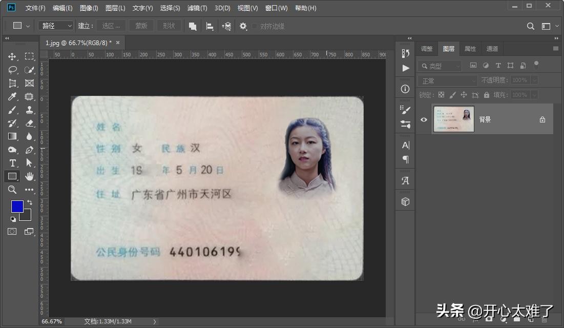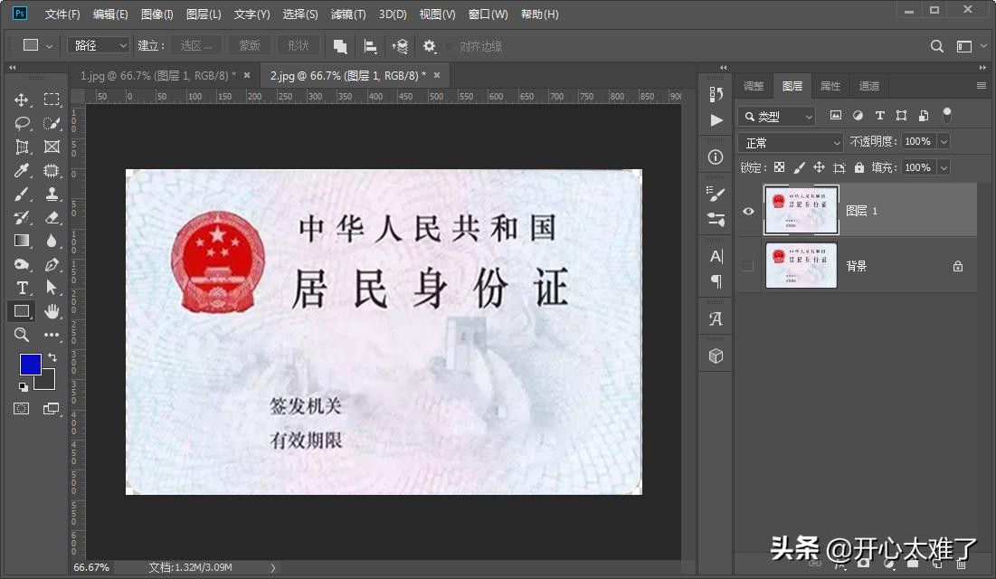 矩形绘制完毕,按“Ctrl+回车”快捷键,把路径转换成选区。按“Ctrl+J”快捷键复制选区。一张身份证制作完成。