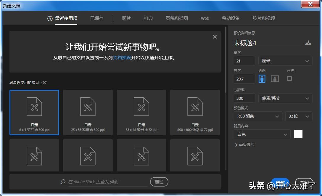 按“Ctrl+N”快捷键新建一个文档,一般身份证复印件使用的是A4大小的纸张,单位选择“厘米”,宽度21高度29.7,创建一个画布A4纸大小的文档。