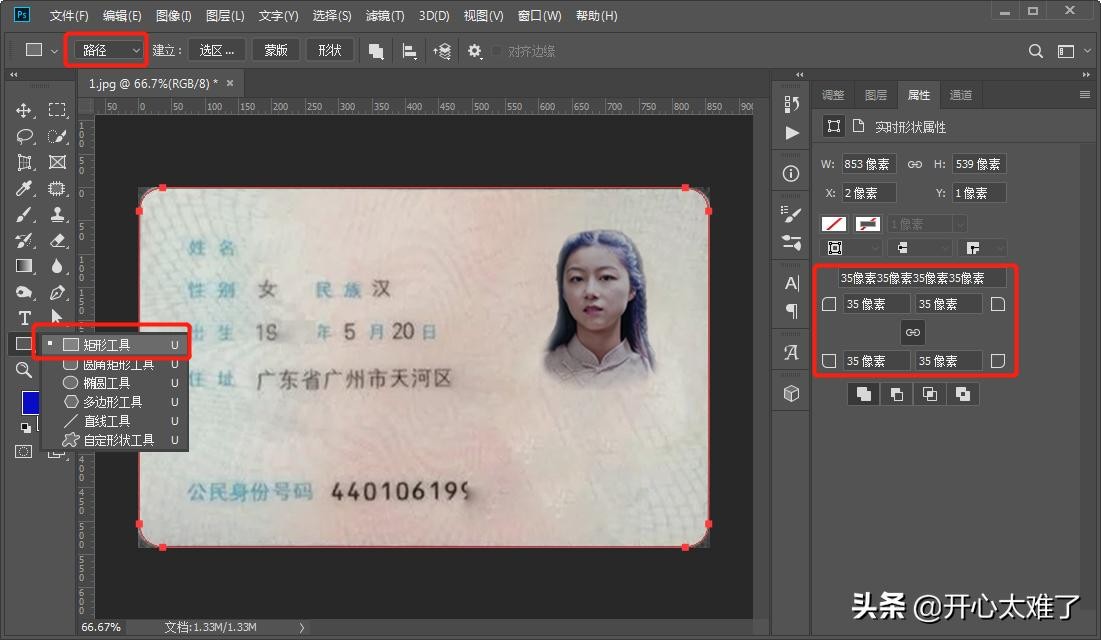 选择“矩形工具”,形状那里改为“路径”。按着鼠标左键不放,绘制一个矩形,矩形的四条边线贴合身份证的四边。绘制矩形的时候,不要放开鼠标左键,按住“空格键”拖动可以移动绘制的矩形的位置,方便准确地框选身份证。绘制完毕,属性面板里面设置圆角半径为35像素。观察身份证的四个角,如果不贴合,可以更改这个半径数值,直到完全贴合身份证的四个角为止。