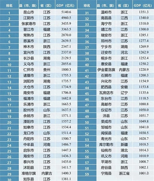 江苏强势领先:江苏有多达25个县(市、旗)进入百强,且在前10名中占据5席,昆山、江阴、张家港等江苏县域经济强县表现尤为突出,GDP均在3000亿元以上,显示出江苏县域经济发展的强劲实力和均衡性。江苏县域经济的优势可能源于其良好的产业基础、发达的制造业、优越的地理位置以及较为完善的基础设施和营商环境,吸引了大量企业投资和产业集聚。