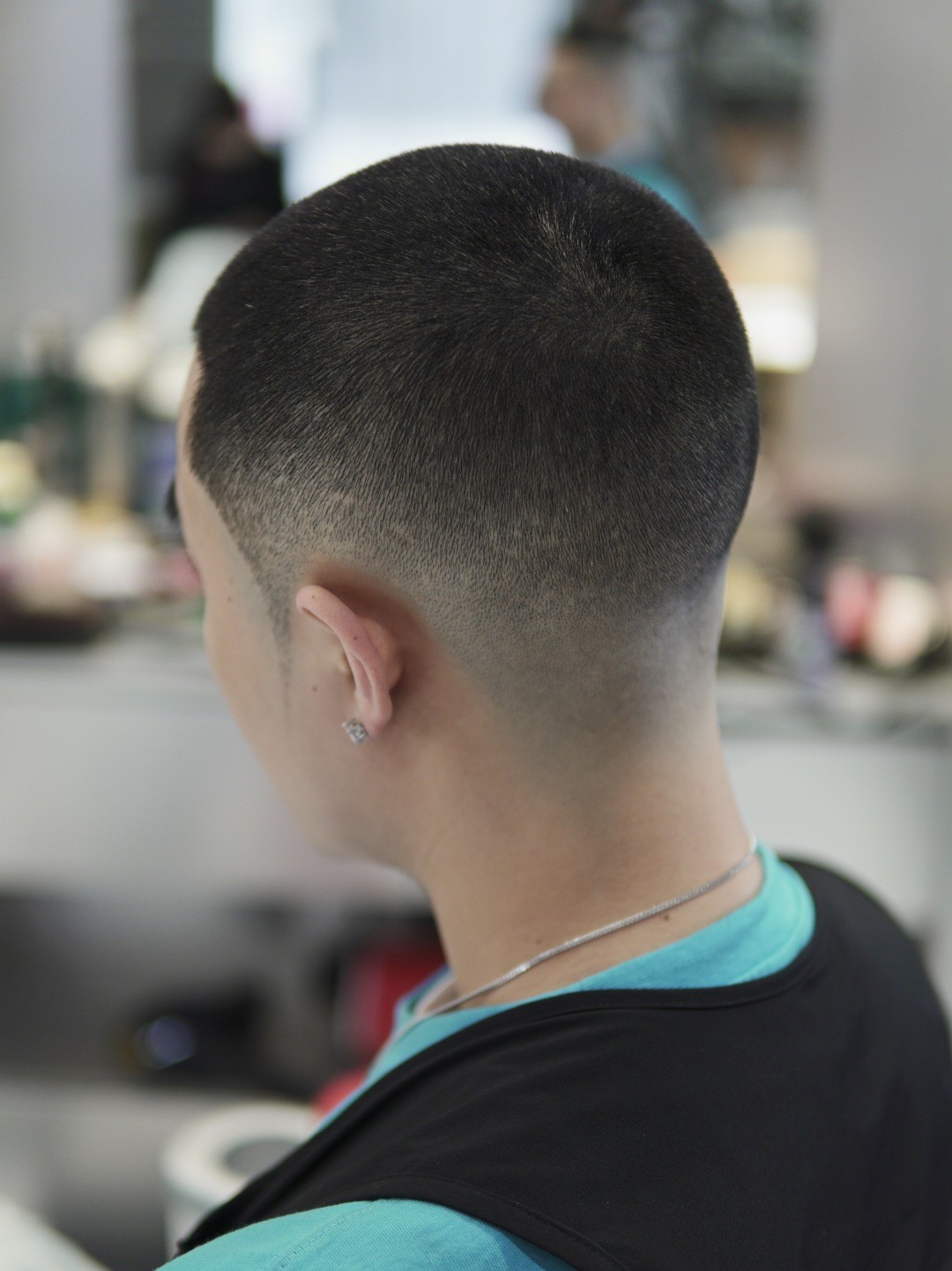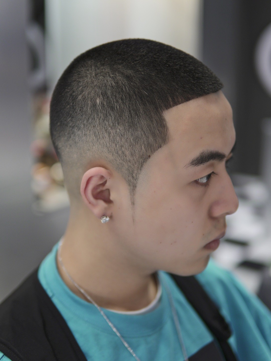 美式圆寸的细节呈现在渐变营造的层次感,以及注重对发际线和鬓角的线条修饰,整体效果整齐干净,可呈现出硬朗清爽、阳光帅气的风格。