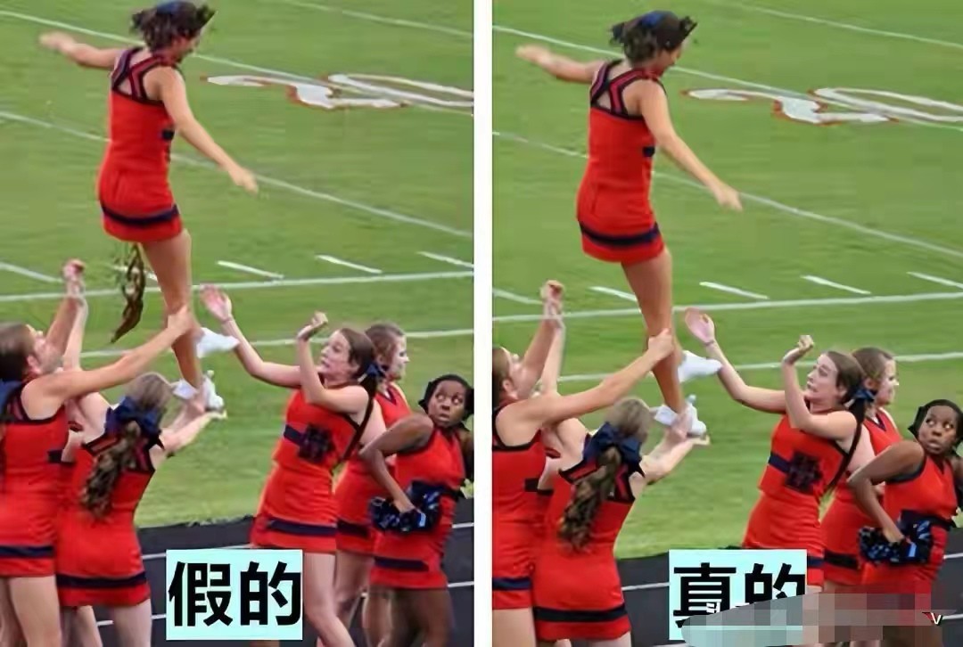 图六:左图显示的是拉拉队队员在被抛向高空时,竟然拉大便了!顿时吓坏了同伴。后经证实,其实是被人恶搞了,真实情况是在被抛向空中时,出现了失误,吓到了下面的队员。