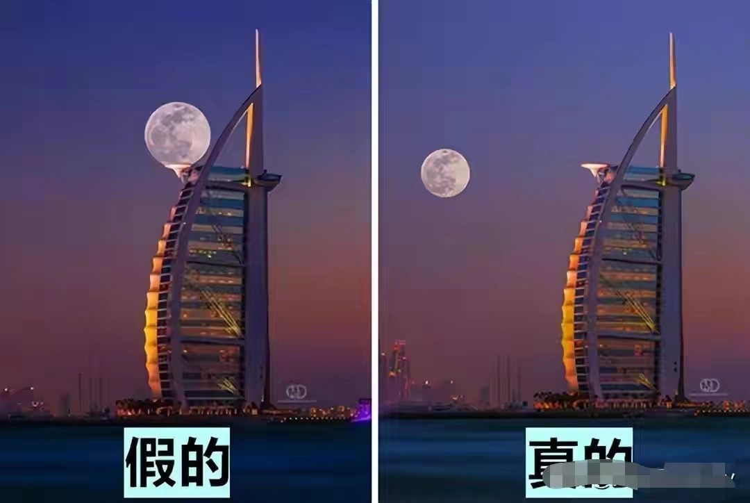 图五:迪拜帆船酒店的宣传图片上显示天空中的圆月落在帆船酒店上,给人以美轮美奂的感觉。其实月亮离酒店很远,照片经过PS处理过的。