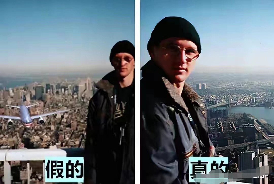 图八:左边这张照片是在911事件后有人上传到网络上的一张照片。许多网友以为这名男子拍到了飞机撞向大楼的瞬间。后来经过核实。发现照片存在许多问题。首先男子穿的是冬装,而当时纽约非常炎热。其实照片中的飞机是波音757,而撞向大楼的是波音767,所以左边这张照片理假的。