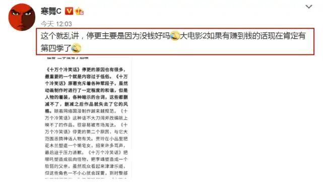对于这样的猜测,作者“寒舞C”进行了回应,表示是因为没钱,而不是因为低俗,这个完全是在乱讲,要是《十万个冷笑话》的第二部电影赚了的话,那早就已经出第四季了。《十万个冷笑话》也就跟它的名字一样,里面充满了笑点,很多人在看的时候可以笑得停不下来。