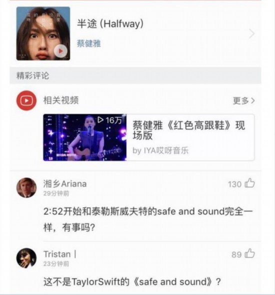 蔡健雅不也是环球音乐的吗?她的新歌要是上架Spotify,她将会从霉霉争取来的权益中拿到钱。我就问问蔡健雅本人和蔡健雅粉丝有脸过来反咬吗?那段旋律确实和我霉的歌太像了,抄的很过分了。safe是我从初中开始,无论遇到什么样的事只要戴上耳机就可以找到自我的治愈曲,佛系粉丝也忍不住了。