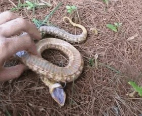 如果这个时候人们将它强行翻个面,猪鼻蛇还会立刻自己翻回来,并且保持张着大嘴吐着舌头,继续一动不动。就好像在用行动示意:我真死了我真死了。