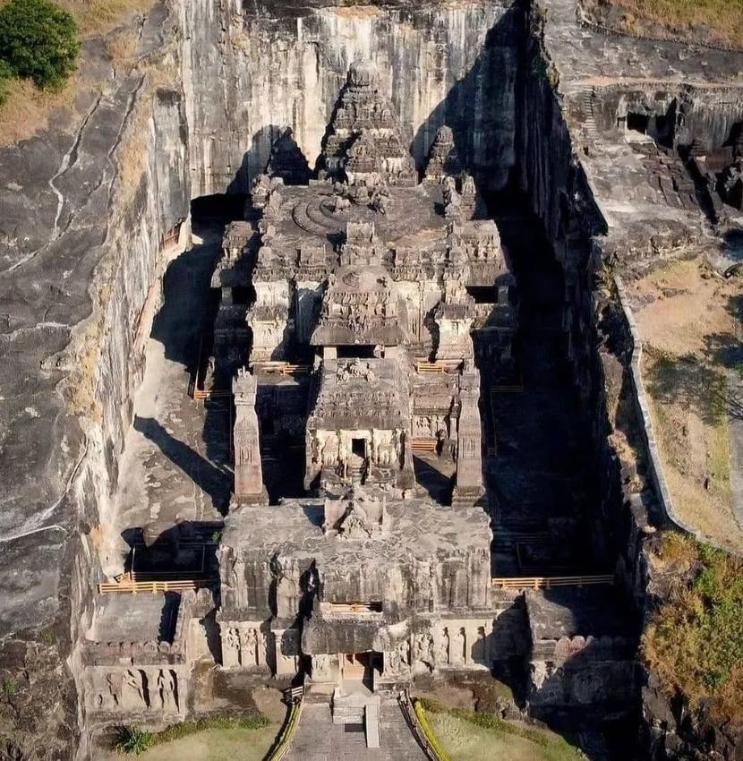 (16)凯拉萨神庙,印度马哈拉施特拉邦。埃洛拉是一个拥有众多印度教、佛教和耆那教寺庙的地方,这些寺庙是在1000多年前雕刻在玄武岩悬崖上的。这座广阔的建筑群由许多独立的房间、拱廊和浮雕组成,它们都是从一块巨大的岩石上切割而成的。