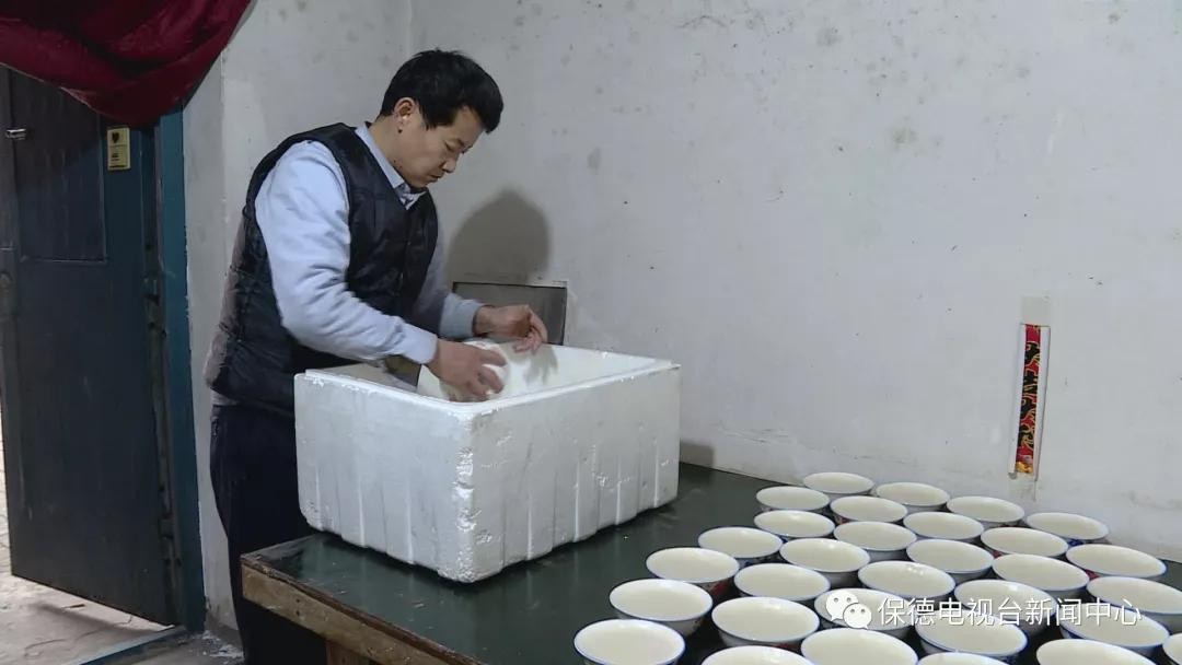记者:我现在手里端的就是美名远扬的保德肉碗托,我们看到这个肉碗托上面,已经铺满了肉酱和醋蒜蘸料,作为一个地地道道的保德人吃碗托还喜欢沾点辣椒酱。