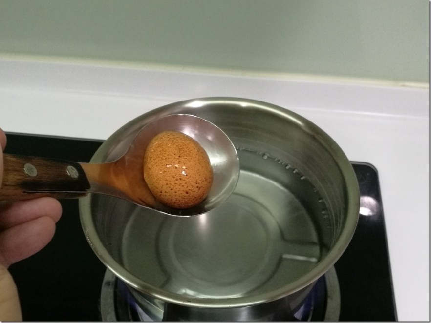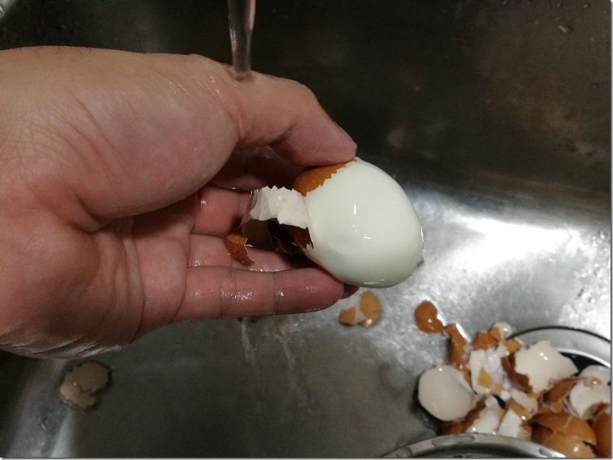 这步骤应该是整个流程中最难的,因为如果你用的是很新鲜的鸡蛋,煮熟的蛋白会与蛋壳黏得很紧,会非常难剥壳。所以大多都会使用保存良好放一週左右的蛋,在剥壳时会比较方便,外型也会比较好看。在剥壳时我会在细微水流下剥壳,会比较容易剥得漂亮(理论上啦)。