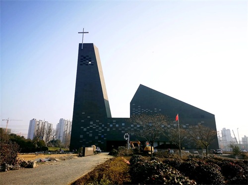 公园大门对着的是相城基督教堂,教堂没有主次立面之分,黑色花岗岩由地至顶一路延伸,它的四周包括顶面都浑然一体,同行的朋友笑称这是经典的"建筑丑学",高耸的十字架在顶部的四分之一处,不知诠释了怎样的意义,总之,从建筑审美角度,让强迫症患者极度不适。