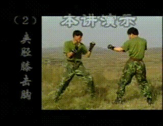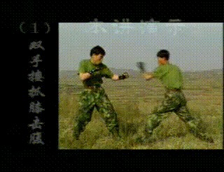 敌我双方均以左格斗式站立对峙;敌方上前以双手抓我双肩不放;我方以双手由敌双臂之间,箍夹敌颈部,向己方搂带,随即提右膝猛力冲顶敌胸腹部。
