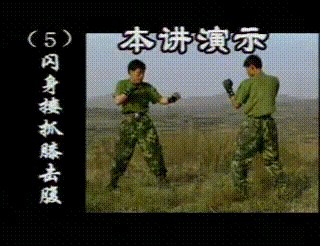 敌我双方均以左格斗式站立对峙;敌以左手探拳虚晃,以右手直拳猛力进攻我方头部;我方立即向左侧身闪躲至敌方右臂外侧,同时用右手反搂敌肩颈部位,用右膝猛击冲顶敌腹部。