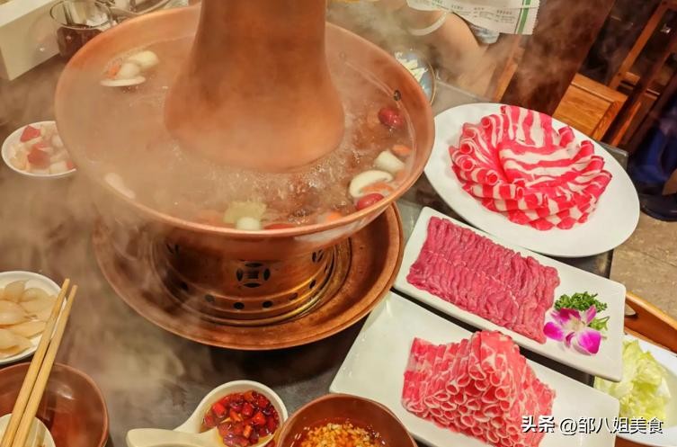 手切羊肉纹理清晰,薄厚均匀,下到滚烫的铜锅里,三提两涮,变色即捞出,裹上麻酱,入口先是羊肉的鲜嫩爽滑,而后是麻酱的咸香,还透着一丝羊肉本身的鲜甜。