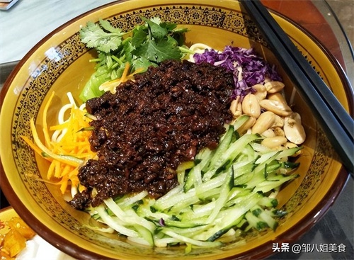 码上豆芽、黄瓜丝、心里美萝卜丝等菜码,把炸酱一拌,面条根根裹满酱汁,质朴又落胃。
