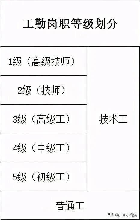 工勤技能岗分六级:普工、五级(初级工)、四级(中级工)、三级(高级工)、二级(技师)、一级(高级技师)。