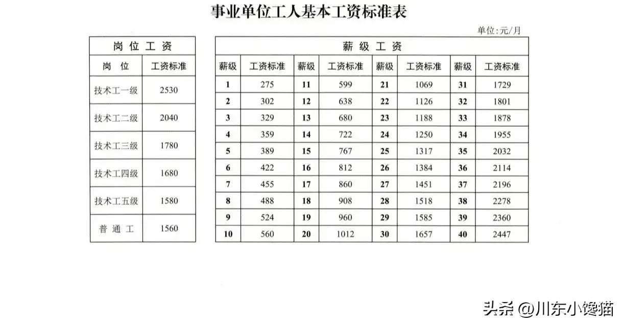 工勤技能岗基本工资最主要的两项是岗位等级工资和薪级工资,按目前执行的标准(2021年10月份调整后的)是普工1560元到一级工2530元、薪级工资由1档的275元到40档的2447元不等,大家可以参照下面的图片详细查看下各等级和各薪级档次的工资标准情况。