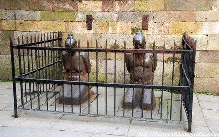 庭园中间有一石桥名精忠桥。过精忠桥便是墓阙,造型古朴,是1978年重修时按南宋的建筑风格造的。墓阙边上有一口井名忠泉。进墓阙重门就是岳飞墓园,墓道两侧有石马石虎石羊各一对,石俑三对正中便是岳飞墓,墓碑上刻着“宋岳鄂王墓”,左边是岳云墓,墓碑上刻着“宋继忠侯岳云墓”,两墓保持宋代的式样。墓前一对望柱上刻有一副对联:“正邪自古同冰炭,毁誉于今判伪真”。墓阙后面两侧分列秦桧、张俊等4人的铸铁跪像,供人唾骂,遗臭万年。墓阙后重门旁有对联一副:“青山有幸埋忠骨,白铁无辜铸佞臣”。