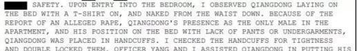2018年8月31日,警方接到电话后,在刘强东位于明尼苏达大学的公寓内将其逮捕。派出的警察说:“和伴侣进入客厅后,我发现刘强东躺在床上,上半身只穿了一件T恤,从腰部以下都是粘糊糊的。”记录显示,警察给刘强东戴上手铐后,还帮他戴上手铐。袜子和裤子,带到警车上搜查。