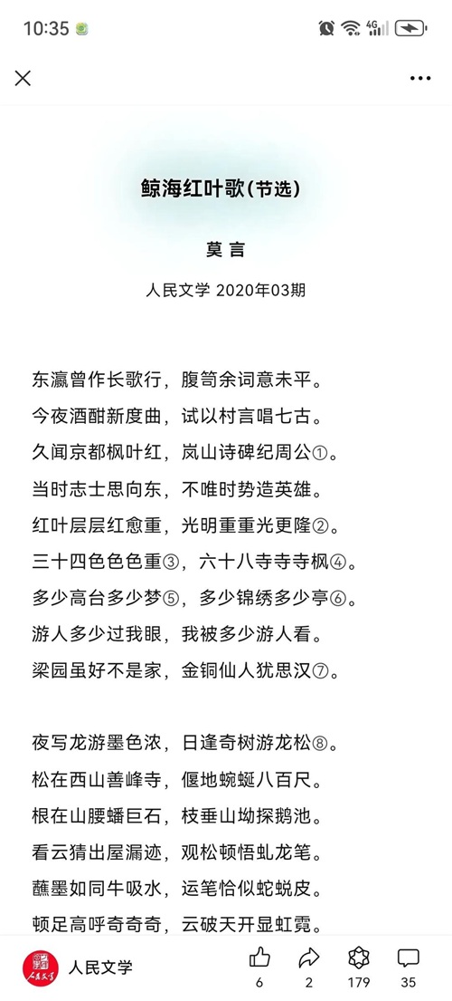 《鲸海红叶谷》和《东瀛长歌行》是莫言长诗方面的佼佼者。