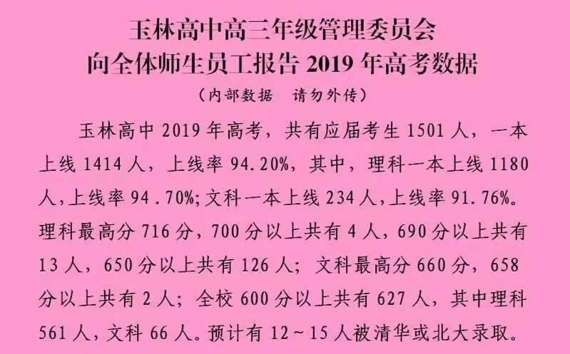 前天发了一篇稿子,网友们讨论得非常激烈,其中说的争议最多的是玉林高中,今天我们就聊聊玉林高中,玉林高中是玉林市唯一一所首批入选广西自治区示范性高中的重点高中,是一所百年名校,学校的知名校友有旅美华人、航空航天专家、美国航天结构动力学技术权威专家唐绍曾,四川大学教授、博士生导师、工程制图专家苏宏庆等等。玉林高中在玉林市一枝独秀,第一的位置无人可以撼动。下面我们根据历年数据就深入分析讨论一下,以下为玉林高中历年高考数据: