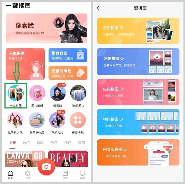 我们可以在首页找到它的【一键拼图】功能,它支持多种图片的拼接方式,可以自由拼接,也能横向或者纵向拼长图。