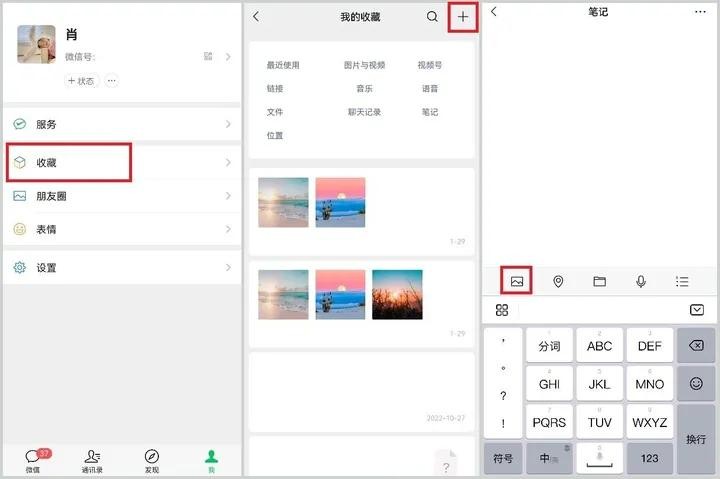打开手机微信,点击【我的】-【收藏】-【+】,新建一个笔记,然后点击下方的图片按钮,按顺序导入所有需要图片。