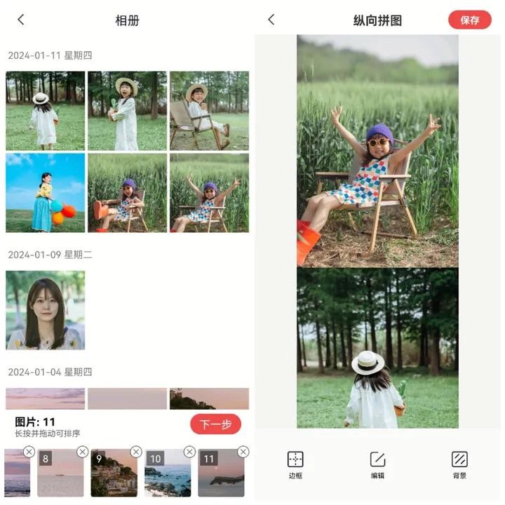 横向拼长图以及纵向拼长图都可以拼接至多20张图片,选择照片之后点击【下一步】就拼接好了,可以调整图片边框、裁剪单张图片大小、调整位置等,点击【保存】就可以了。