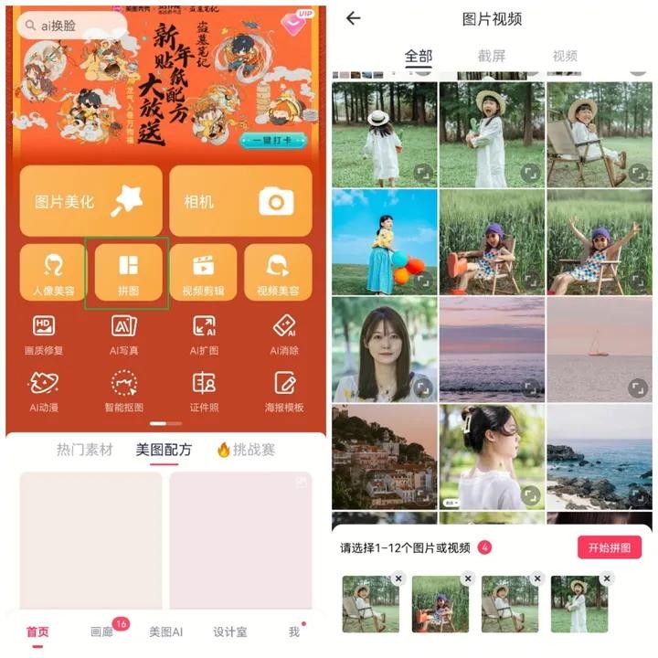 美图秀秀算是比较经典的一款修图软件了,它也支持拼图的功能,首页就可以直接看到。这个功能支持拼接1-12张图片,选好照片之后点击【开始拼图】。