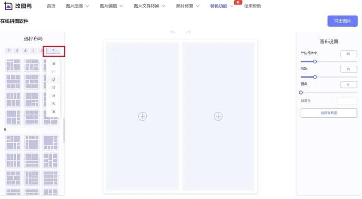 它可以按照图片数量选择模板点击上传图片,至多可以拼接16张图。
