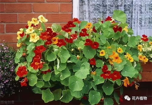 叶肥花美,花色有紫红、橘红、乳黄等,金莲花蔓茎缠绕,叶形如碗莲,乳黄色花朵盛开时,如群蝶飞舞。